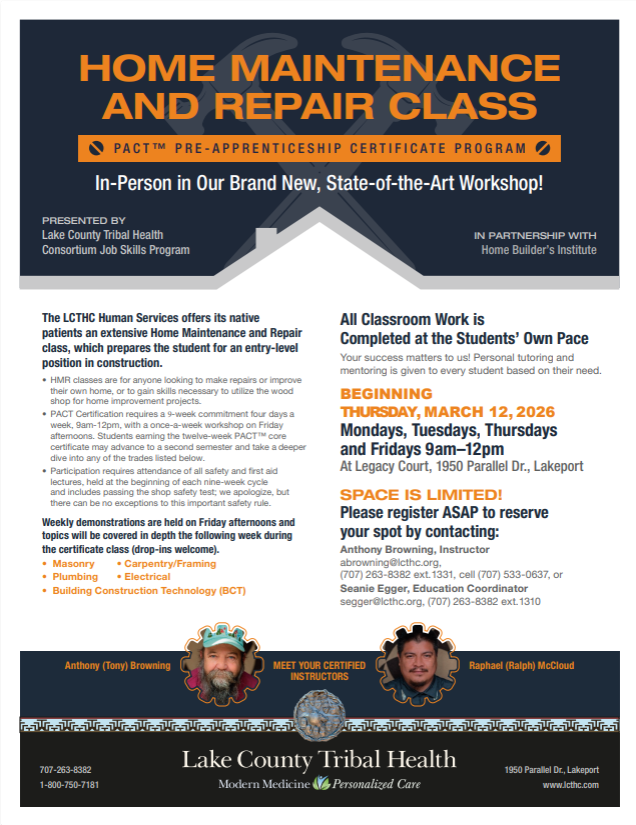 LCTHC's Job Skills Program is offering its Native patients an extensive Home Maintenance and Repair Class, which prepares the student for an entry-level position in construction. This 9-week class is set to begin Thursday, March 12th in our workshop at Legacy Court.