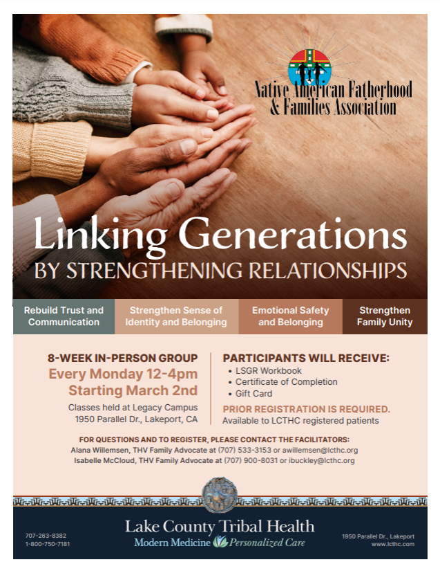 Join our Human Services Department for the Linking Generations by Strengthening Relationships 8-week in-person group. Participants will learn how to rebuild trust, strengthen identity and belonging, foster emotional safety, and support family unity. Classes are held every Monday from 12pm-4pm at Legacy Court.