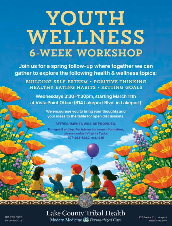 Our Public Health Department will be hosting a 6-week Youth Wellness Workshop for youth ages 8 and up, focused on building self-esteem, positive thinking, healthy eating habits, and goal setting. The workshop begins March 11th and will take place on Wednesdays from 3:30pm-4:30pm at our Vista Point office.